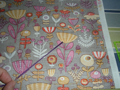 There are many ways to cut circles, but here is my way. Use a string (in this case, I had a needle with embroidery floss on it within arm's reach, but a piece of yarn or other string tied around a pin would work just as well), put it in/on your fabric, mark the string at HALF the cut diameter(for a 6" dia. basket, mark at 3.25). Then use the mark on the string to mark your circle, like so. Hint: once you have one circle cut out, lay it on top of the second fabric and use as a pattern!