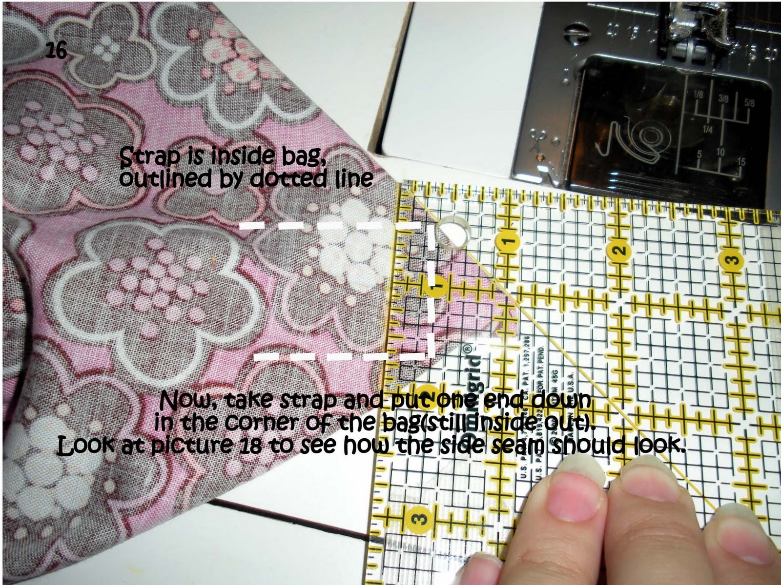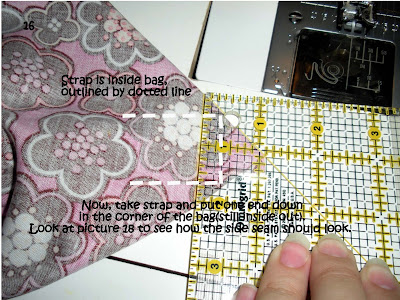 Put one end of your handle between the front and back pieces at the seam. Pin. Now start pinning the outside and lining together, working around to the side opposite the seam. Pin the loose end of the handle between the layers directly across from the end in the seam.